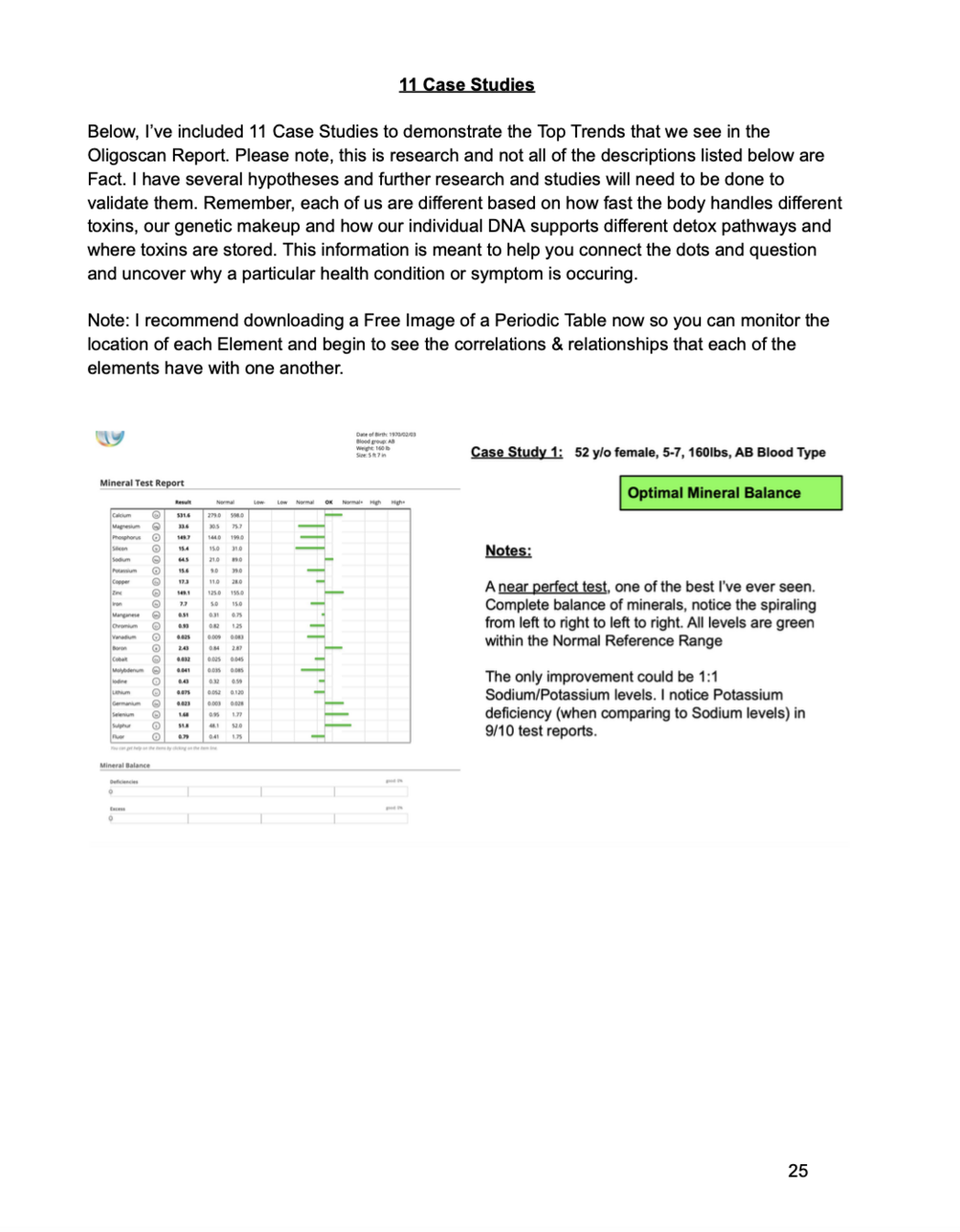 Over the past 9 years, I've scanned over 5,000 people with the Oligoscan. I've correlated test reports with what people have told me & their symptoms to uncover the root cause of imbalance or "dis" "ease". 99% of people that I test in America have at least one mineral deficiency and this isn't a shock: when you grow food in mineral deprived soil, increase overall stress (society), and deprive your skin of natural sunlight, there will be deficiency, period. I recommend going to Cronometer.com and keeping a 2 day Food Dairy. After you complete this, look to see what % of the RDA (which is low to begin with) you are at regarding minerals. Compound this over several years...